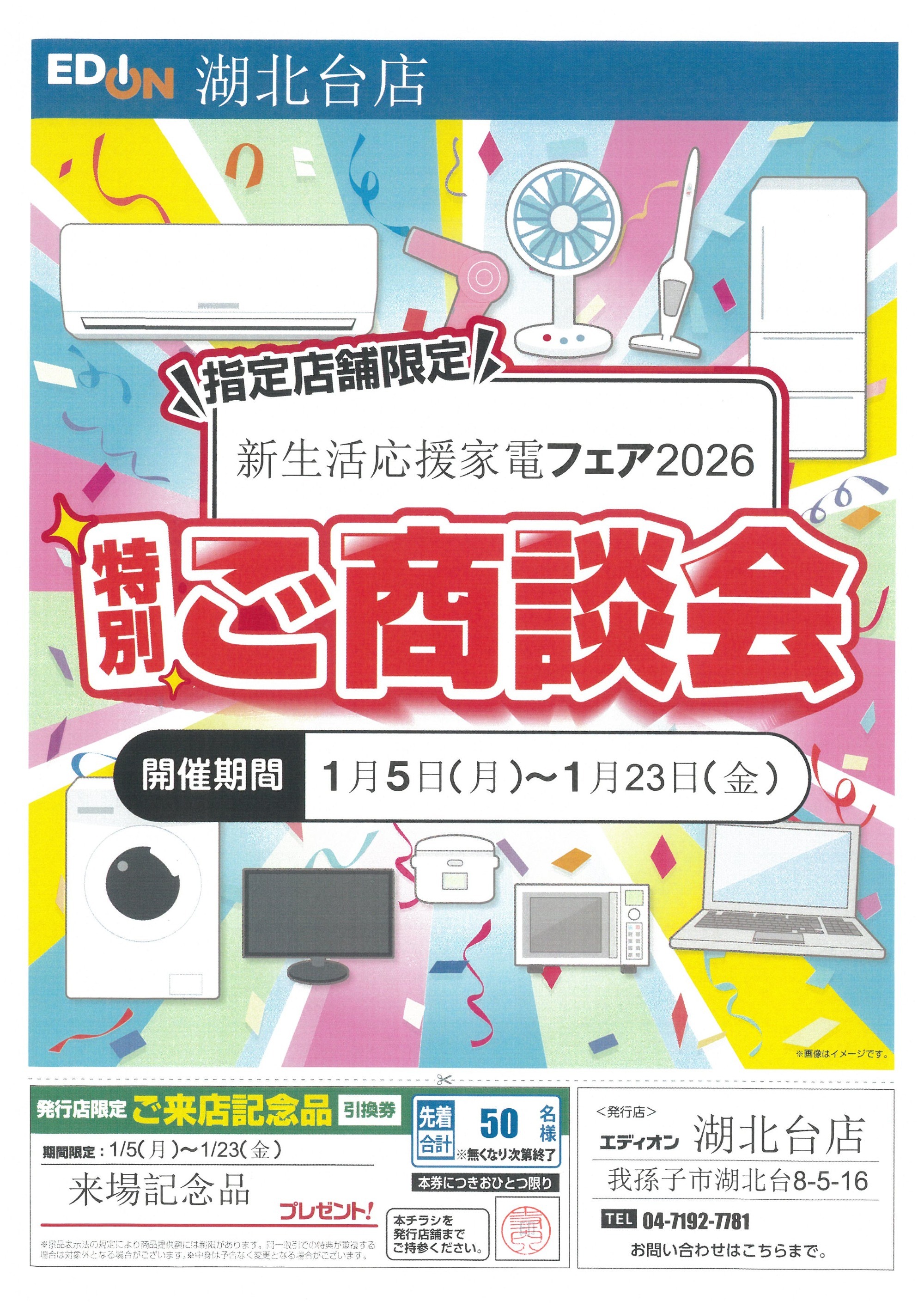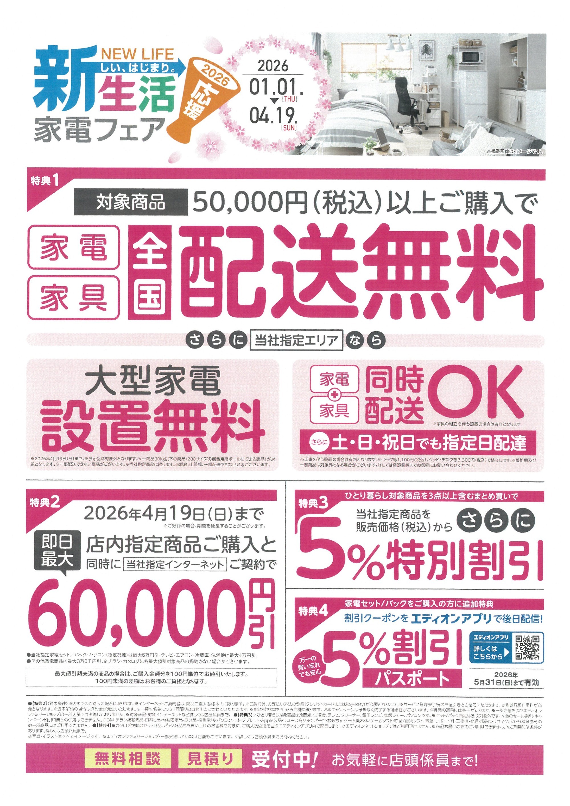 NEW 2026年1月5日(月)~ 1月23日(金)「新生活応援家電フェア2026」を開催中です。